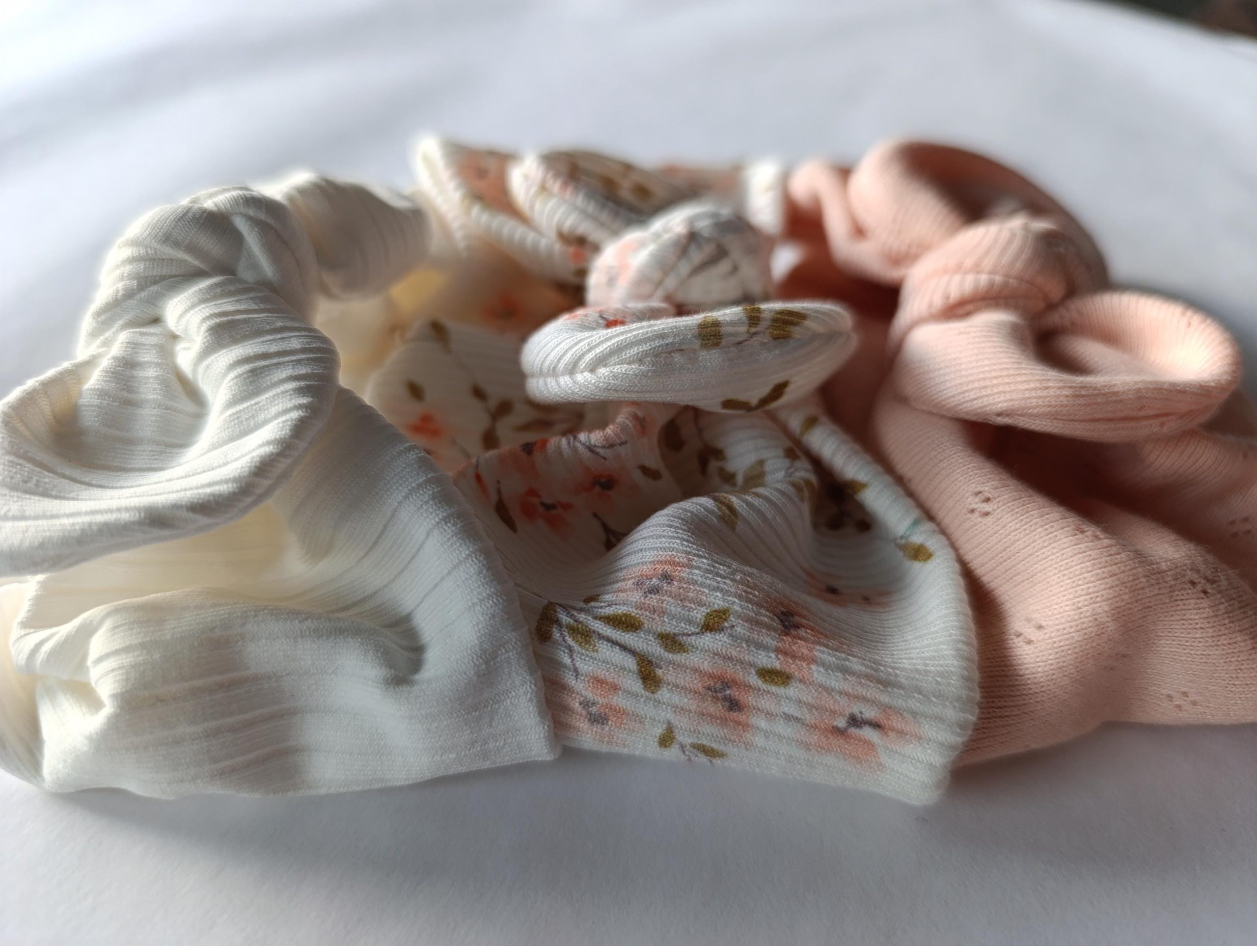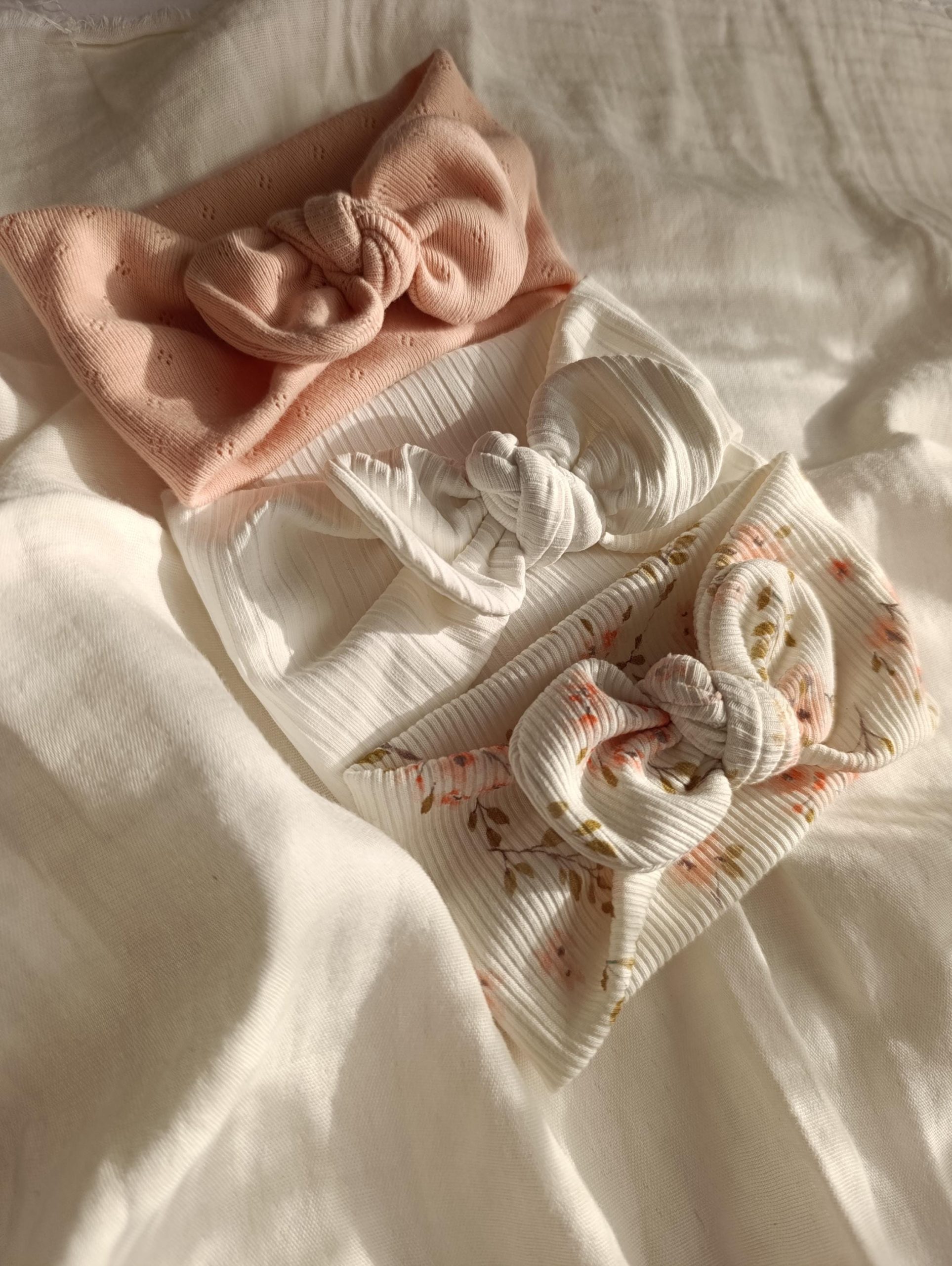 Este delicado pack de tres cintas es un homenaje a la suavidad, la ternura y el cuidado consciente. Hechas a mano, cada una es suave, elástica y perfecta para pieles sensibles, desde recién nacidas hasta adultas.